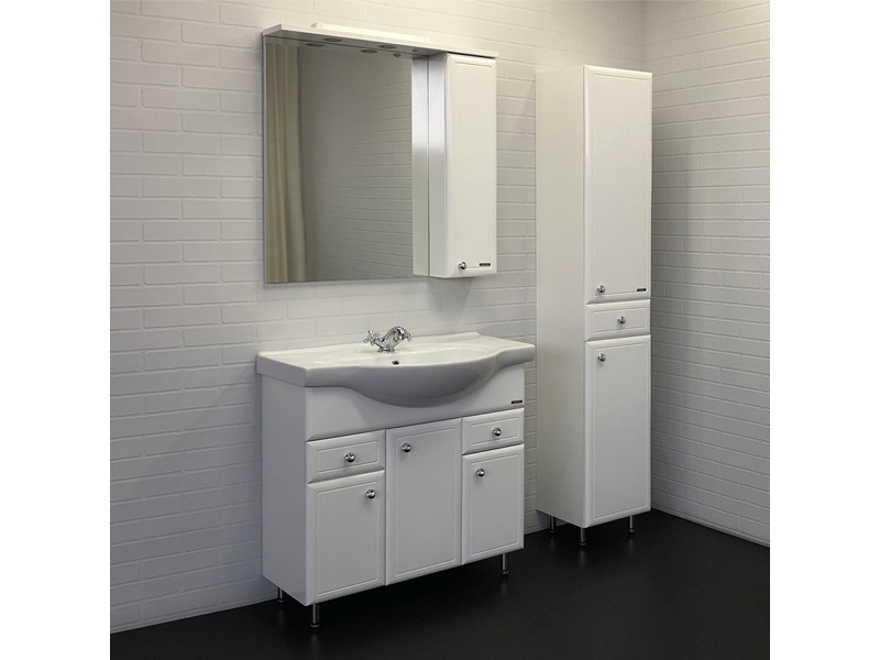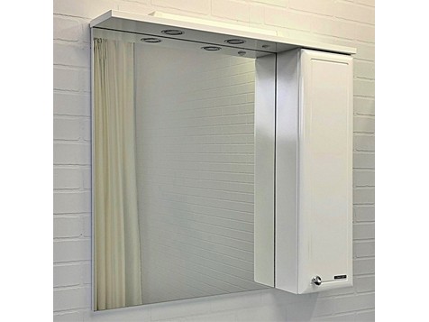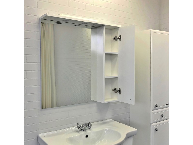 Высококачественное зеркальное полотно с амальгамой на основе серебра. Боковой шкаф окрашен белой глянцевой эмалью. Дверца шкафа оснащена петлями с плавным закрыванием. Зеркало оснащено двумя галогеновыми светильниками.
