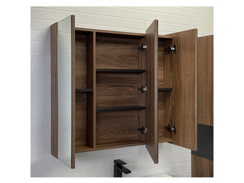 Корпус шкафа из влагостойкого ЛДСП Дуб темно-коричневый. Обе боковые створки зеркала открываются наружу. У средней центральной секции петли справа. За широкой створкой две горизонтальные полки, за узкими по одной.