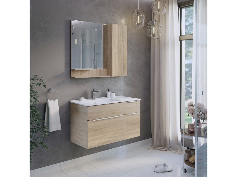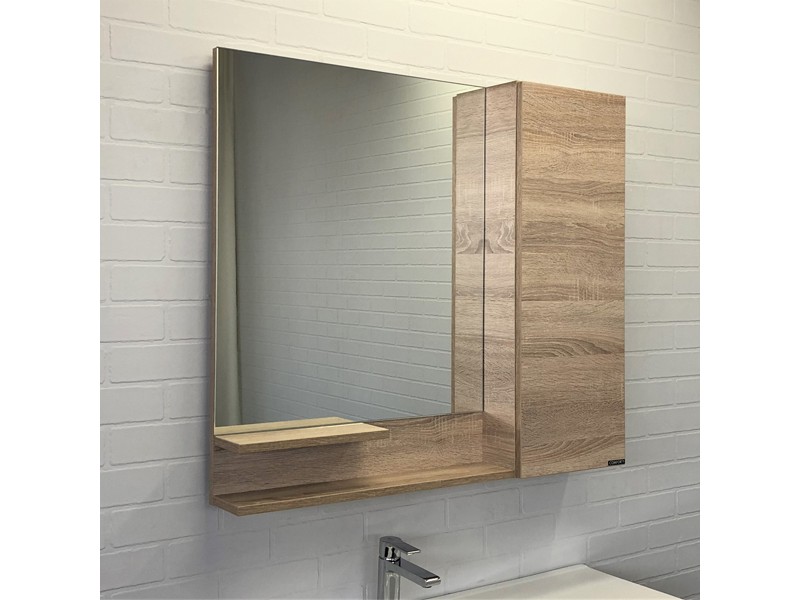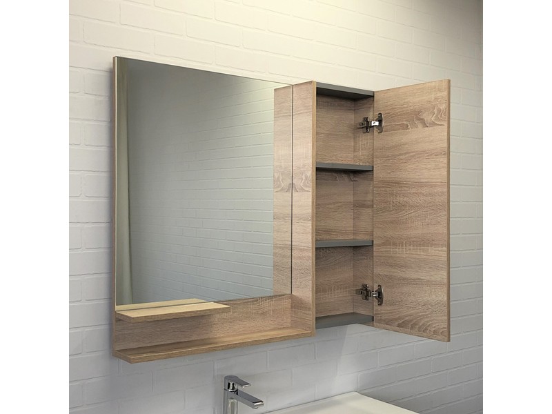 Створка оснащена петлями с плавным закрыванием. За створкой две горизонтальные полки. Высококачественное зеркальное полотно с амальгамой на основе серебра. Удобные полочки для размещения принадлежностей для умывания. Дополнительно можно укомплектовать светильником.