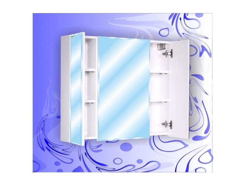 Функциональный шкаф-зеркало "Коралл" изготовлен в виде зеркального шкафчика с двумя узкими распашными дверцами и одной широкой.