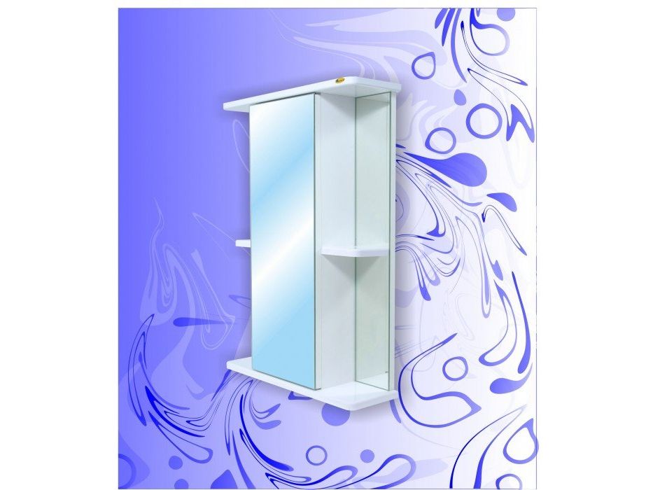 Центральное место занимает зеркальный шкафчик с разделительными полочками, где удобно хранить парфюмерные и косметические средства.