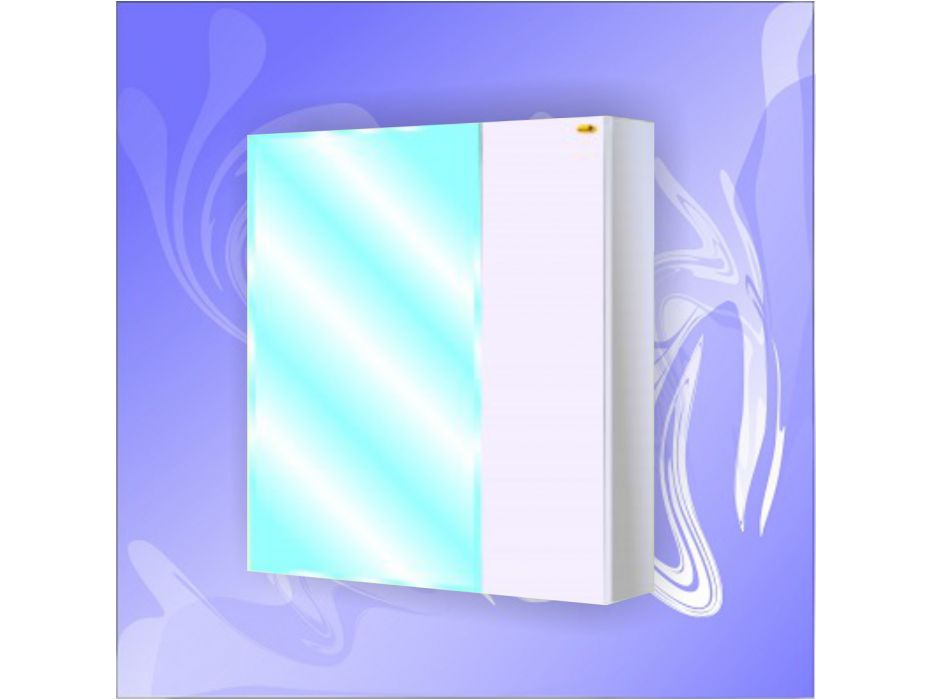Изготовлен в виде шкафчика с двумя распашными дверцами: одна из них широкая зеркальная, другая узкая, фасадная.