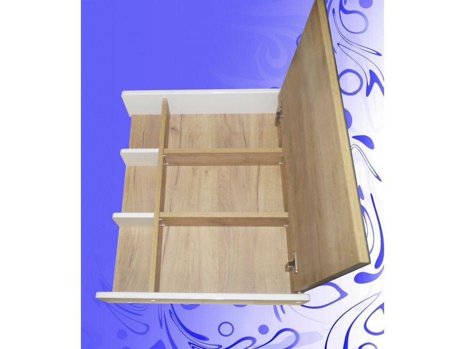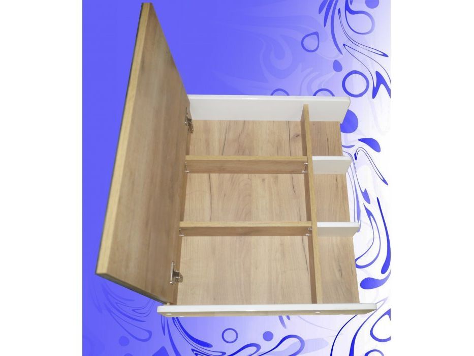 Особую стилистику задает сочетание белоснежного фасада и древесный оттенок каркаса тумбы и внутренних элементов.