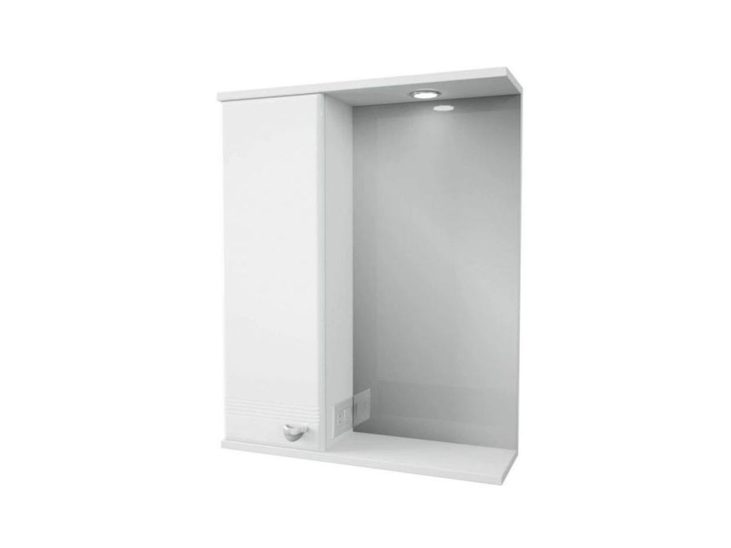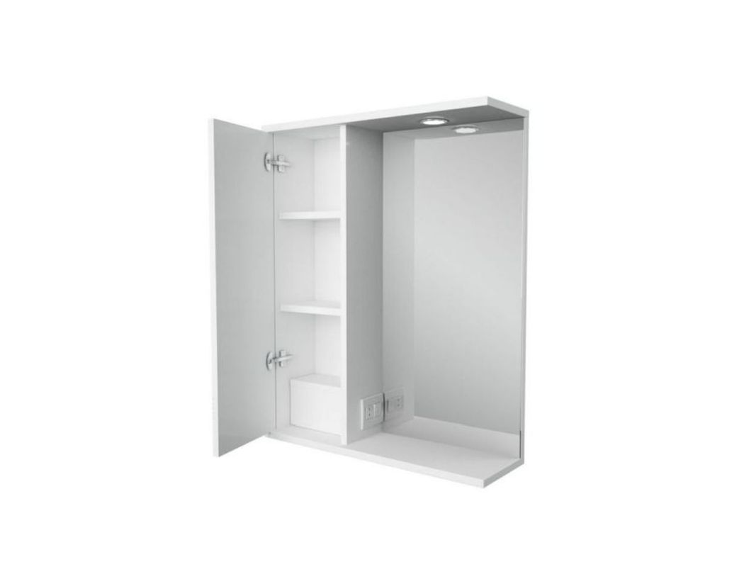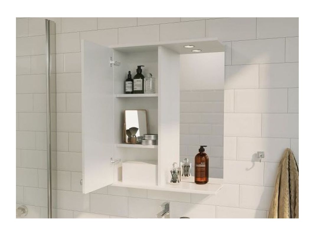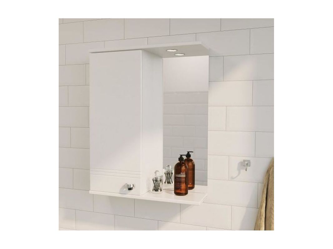 Элегантный зеркальный шкаф, станет практичным решением для небольших ванных комнат. Корпус, выполненный из влагостойкой ЛДСП, и фасад из МДФ покрыты белой ПВХ пленкой с высокой степенью глянца. Шкаф имеет верхнюю панель со встроенной подсветкой, выключателем и розеткой. Внутри за распашным фасадом-створкой расположены три полки. Плавное закрывание обеспечивают петли с доводчиком.
