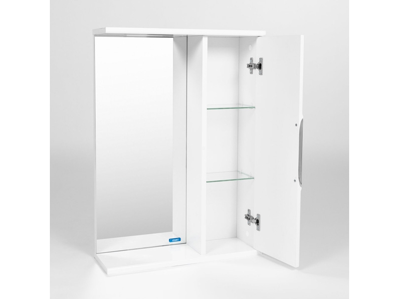 Подвесной зеркальный шкаф шириной 50 см для ванной комнаты с одной створкой. За створкой две стеклянные полки.