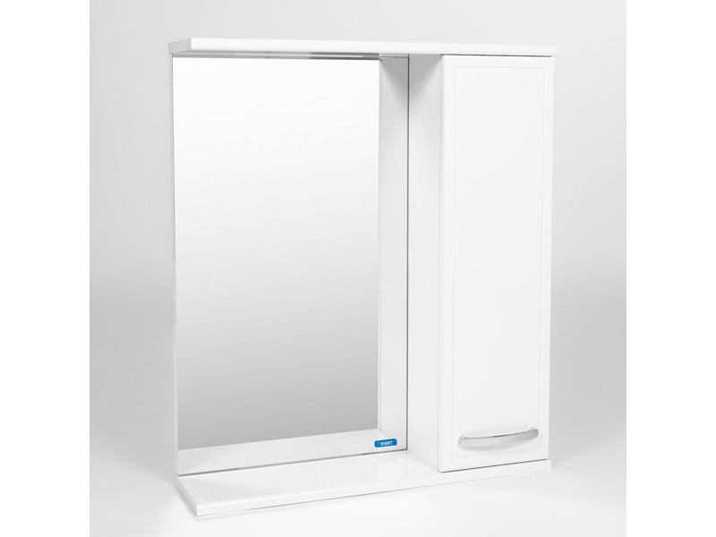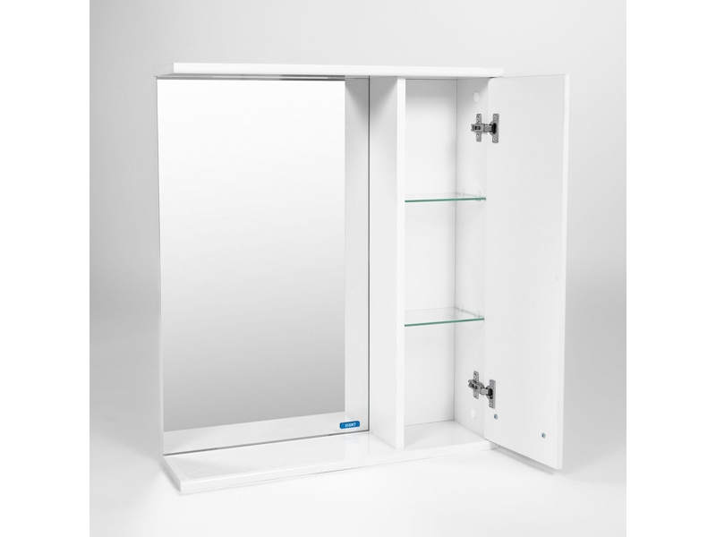 Подвесной зеркальный шкаф Виант Милан шириной 60 см для ванной комнаты с одной створкой. Петли створки справа. За створкой две стеклянные полки.