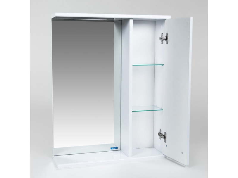 Подвесной зеркальный шкаф для ванной комнаты с одной створкой. Петли у створки справа. За створкой две стеклянные полки