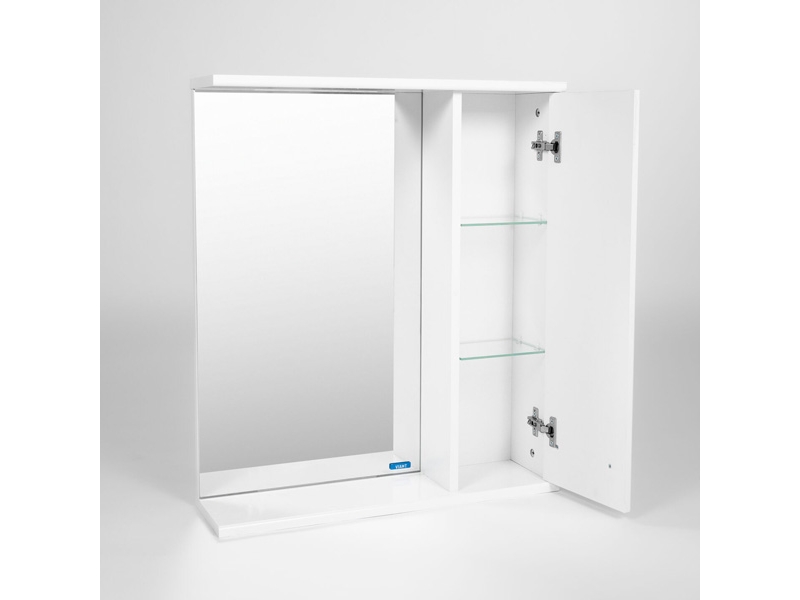 Подвесной зеркальный шкаф Виант Вена шириной 60 см для ванной комнаты с одной створкой. Петли створки справа. За створкой две стеклянные полки.