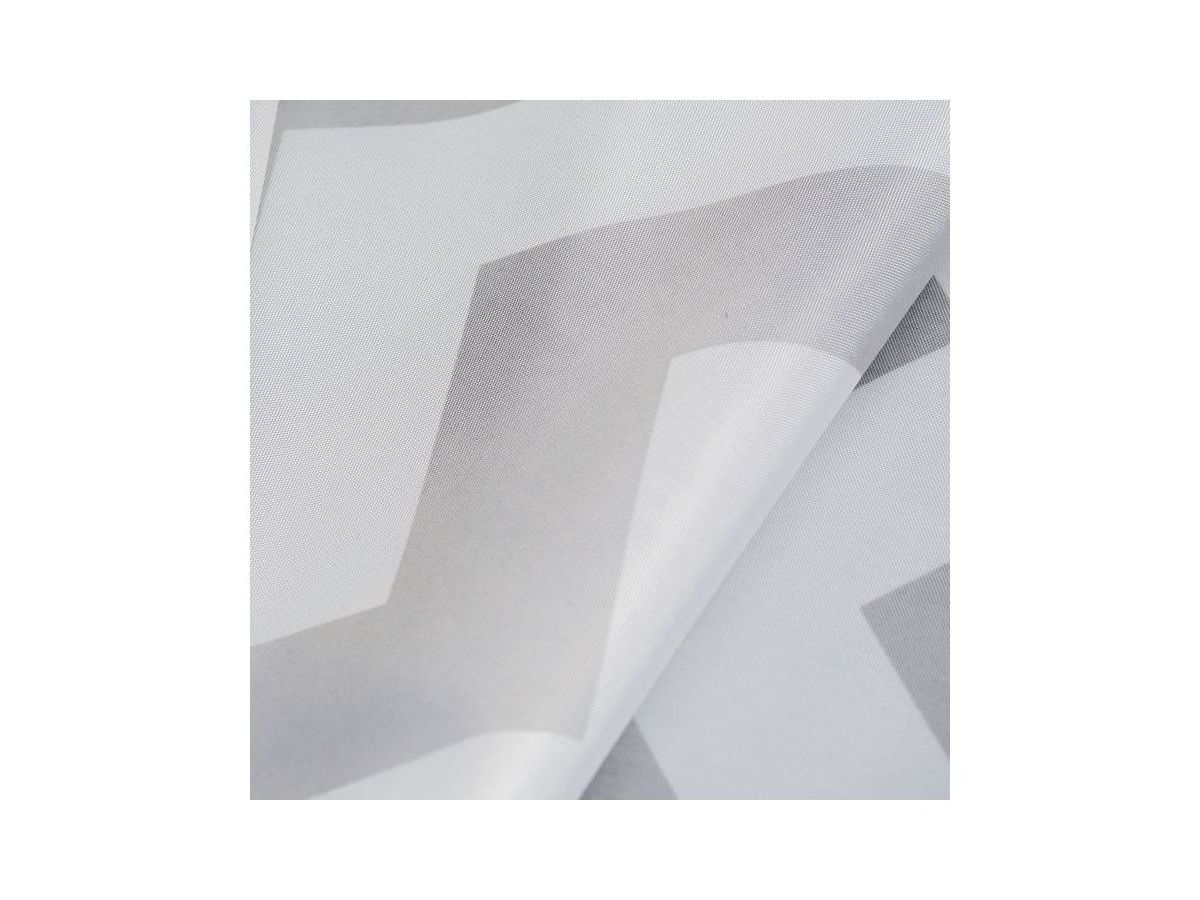 Непрозрачная штора для ванной с универсальным принтом в виде горизонтальных серых полос-зигзагов. Штора изготовлена из полиэстера с красивой атласной текстурой и деликатным блеском. Штора имеет утяжеляющую нить по нижнему краю, которая позволяет избежать задирания ткани, белые пластиковые люверсы, кольца в форме буквы С из белого пластика.