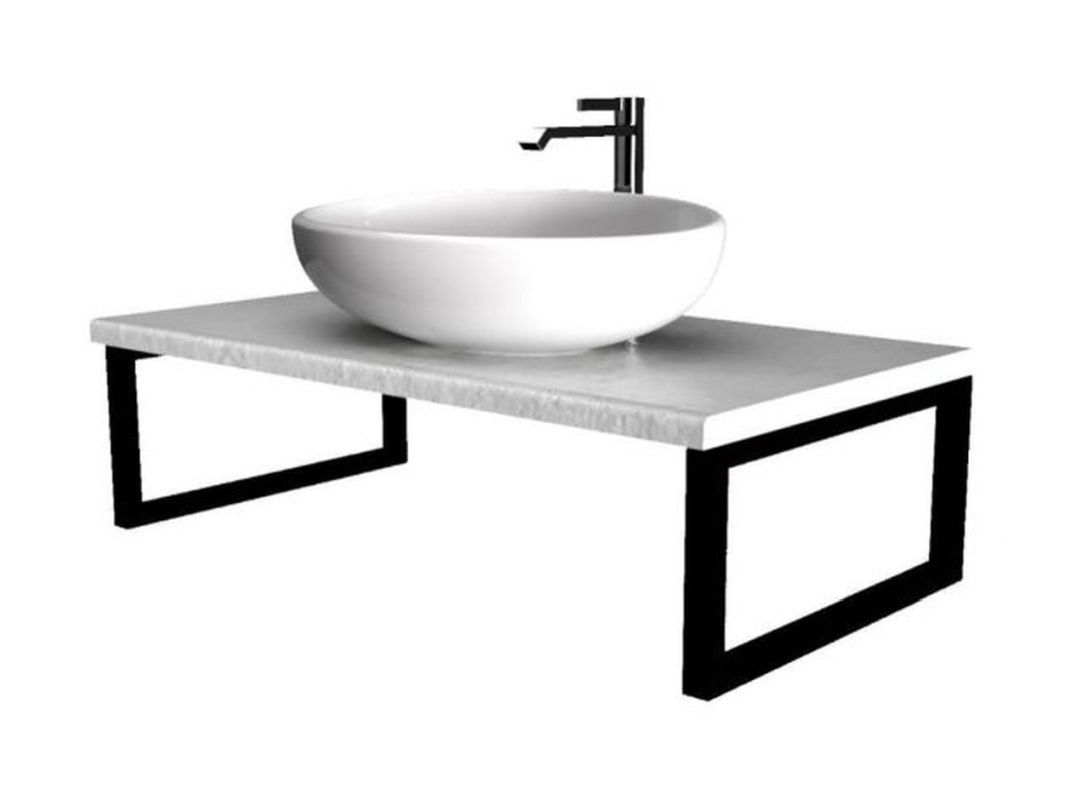 Изделие крепится на металлические кронштейны, которые работают элементом декора и боковыми полотенцедержателями.